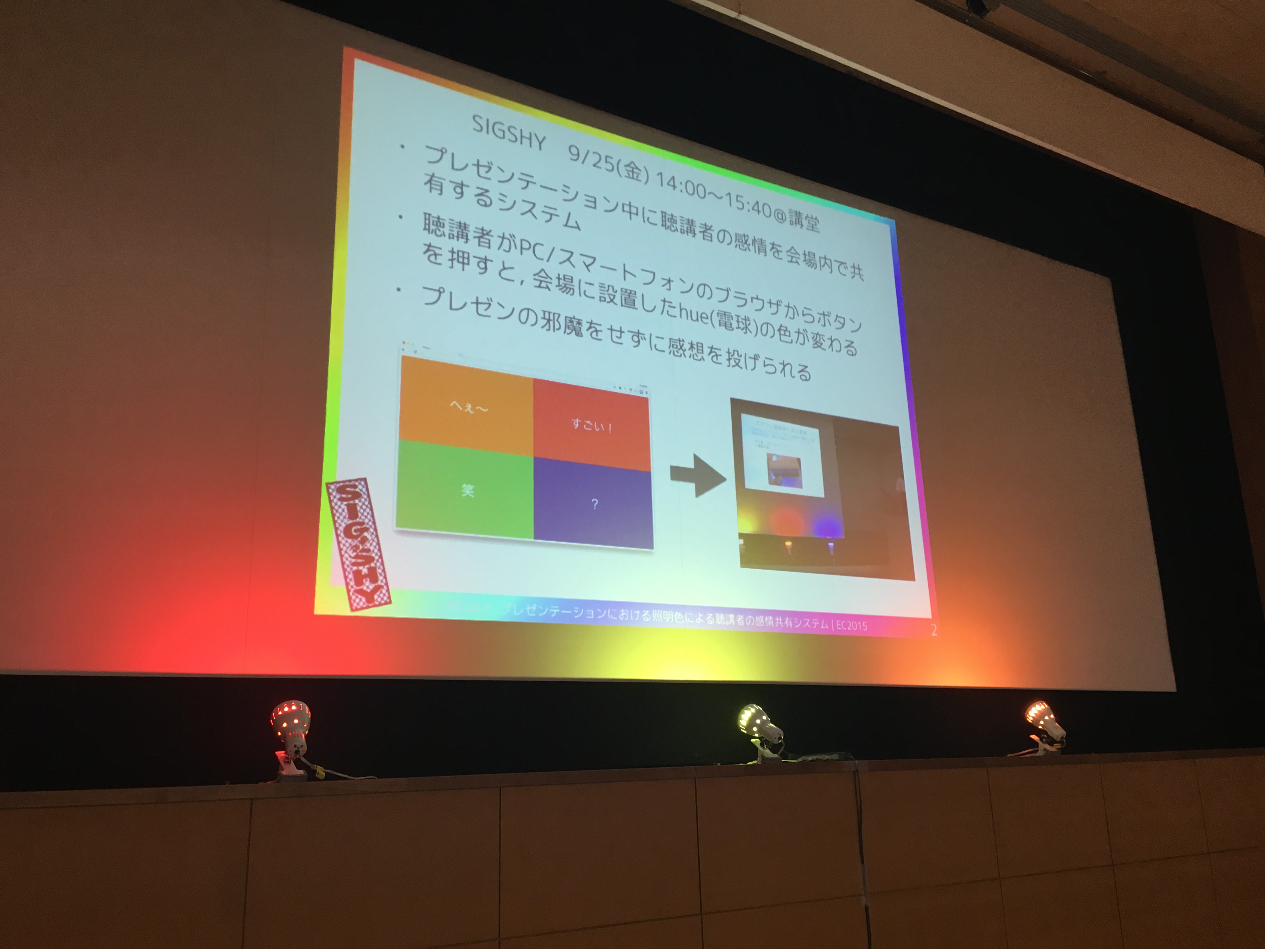 湯村 翼, リム 勇仁, 丹 康雄. PICALA: 聴講者の感情を照明色で表現するインタラクティブなプレゼンテーション, NICOGRAPH 2016 講演集, pp.57-64.