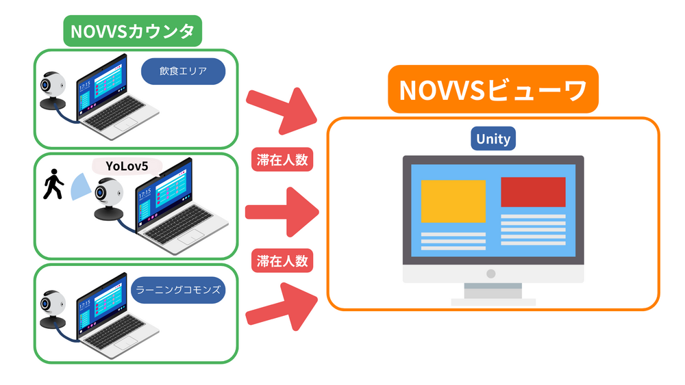 北海道情報大学の図書館は建物3フロア分あり,職員が特定のエリアに集中しているため,上層階や奥まったスペースでは目の届かないところが多い.そのため,利用者数の把握が難しく,適切なサービス提供が困難である.そこで本研究では,Webカメラを用いた滞在人数可視化システムを開発する.館内に設置されたWebカメラから画像処理で人物認識を行い,リアルタイムでデータを収集し,滞在人数の可視化を行う.また図書館の自由に関する宣言に基づきプライバシーを考慮したシステム設計を目指す.これにより,職員の状況把握や利用者の利便性向上が期待される.